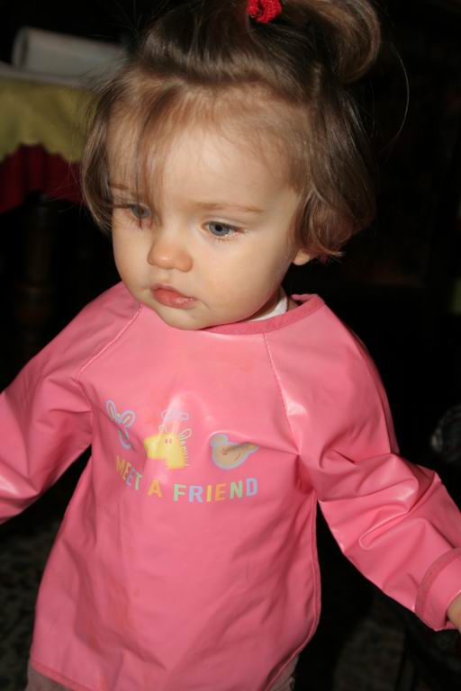 Et voici la tenue de combat pour les repas. A cet age, la seule façon de manger et de prendre les aliments avec les mains. Alors avant tout, on protège l'environnement