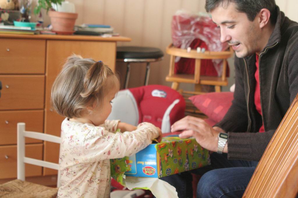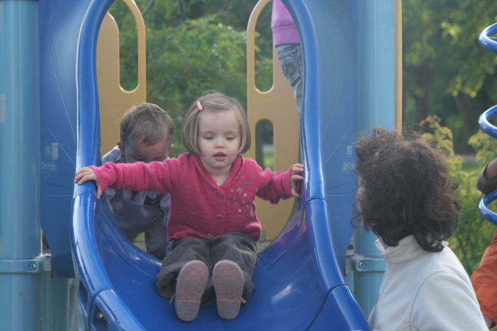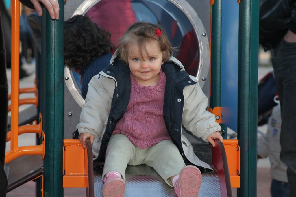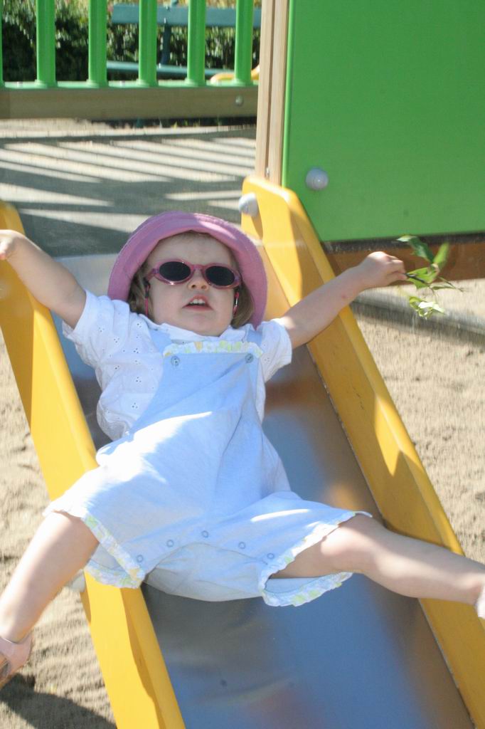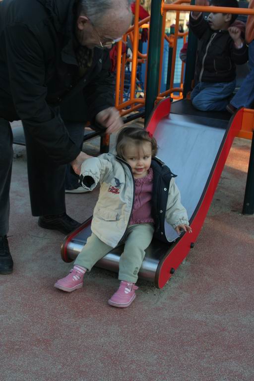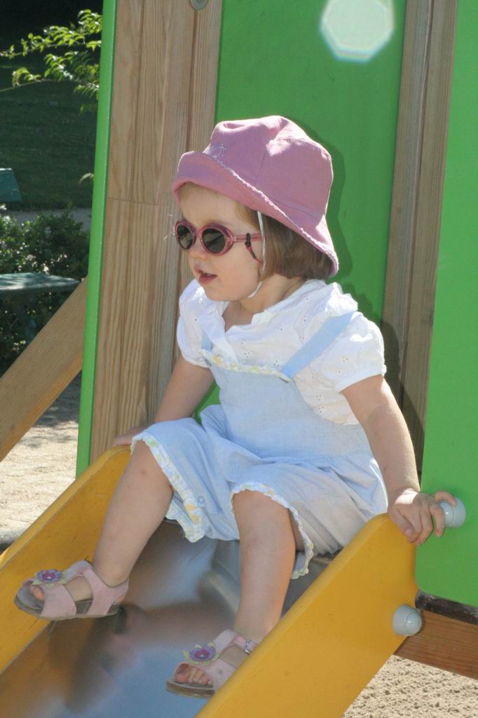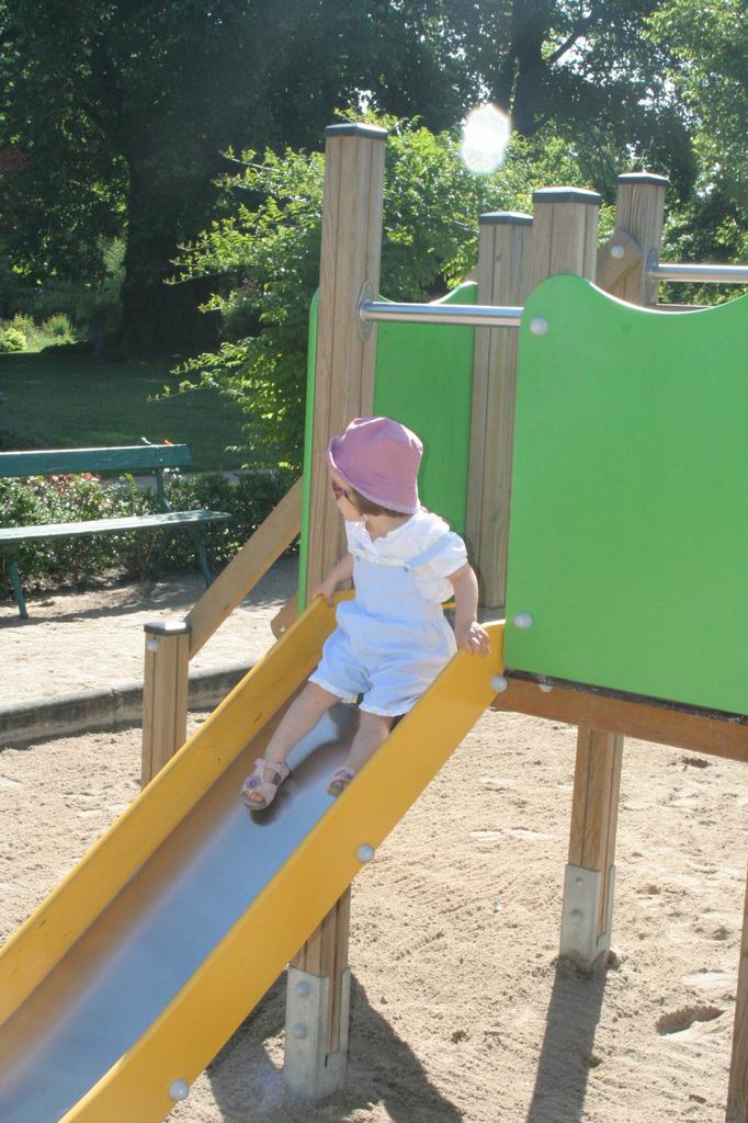 Les premiers déscentes de tobogan méritent le soutien du grand-père. Clarysse est casse-cou mais pas totalement rassurée tout de même.