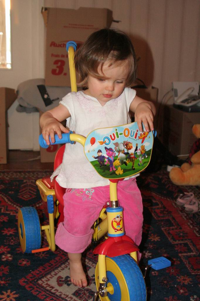 Premier vélo, .... comme c'est écrit sur la boite, à partir de 18 mois; Et bien malgré sa taille (très grande pour son age), elle ne touchait pas les pédales.